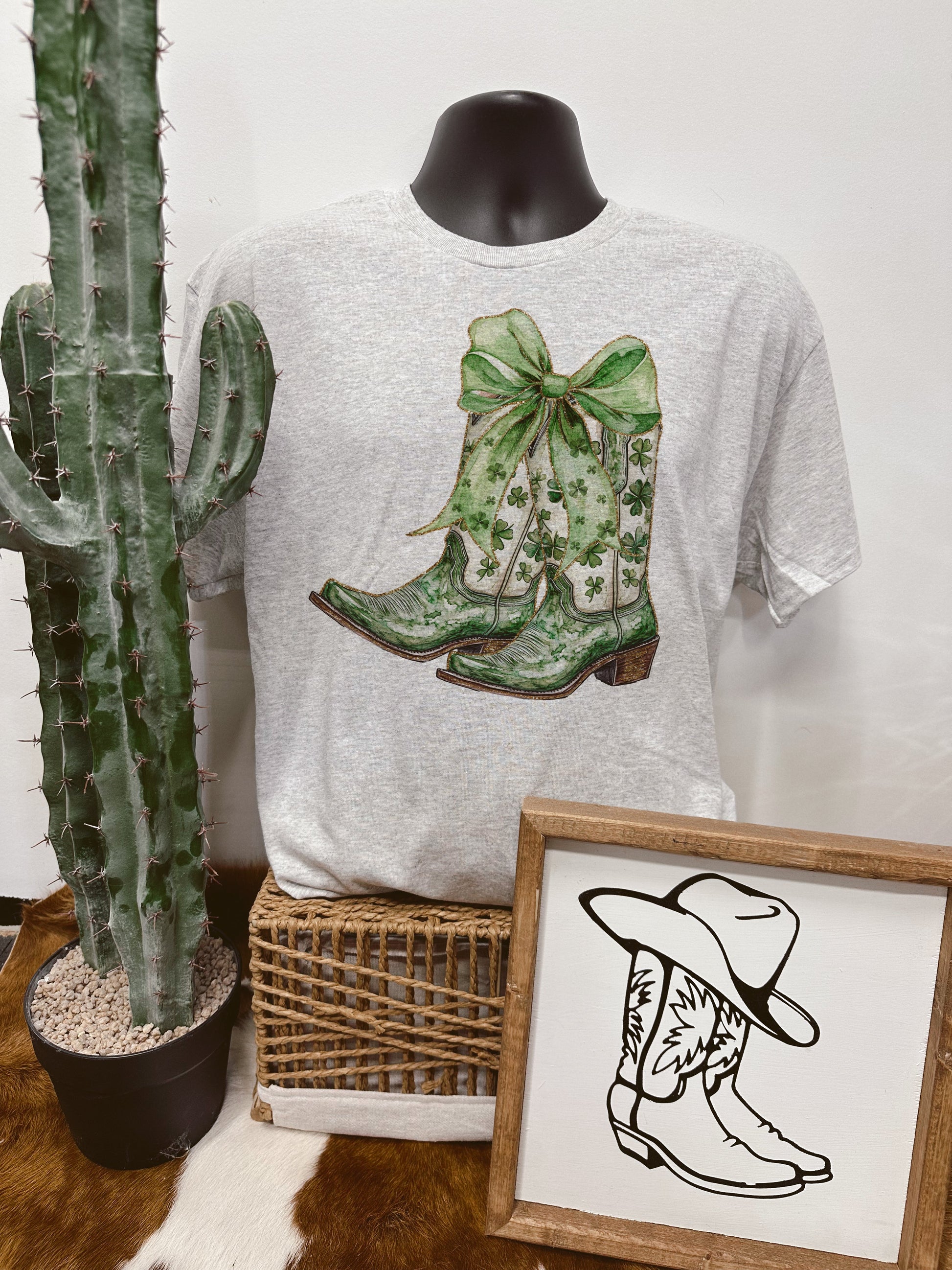 Lucky Boots by Walking A provides a unisex fit on an ash, white, or sand tee or crew.