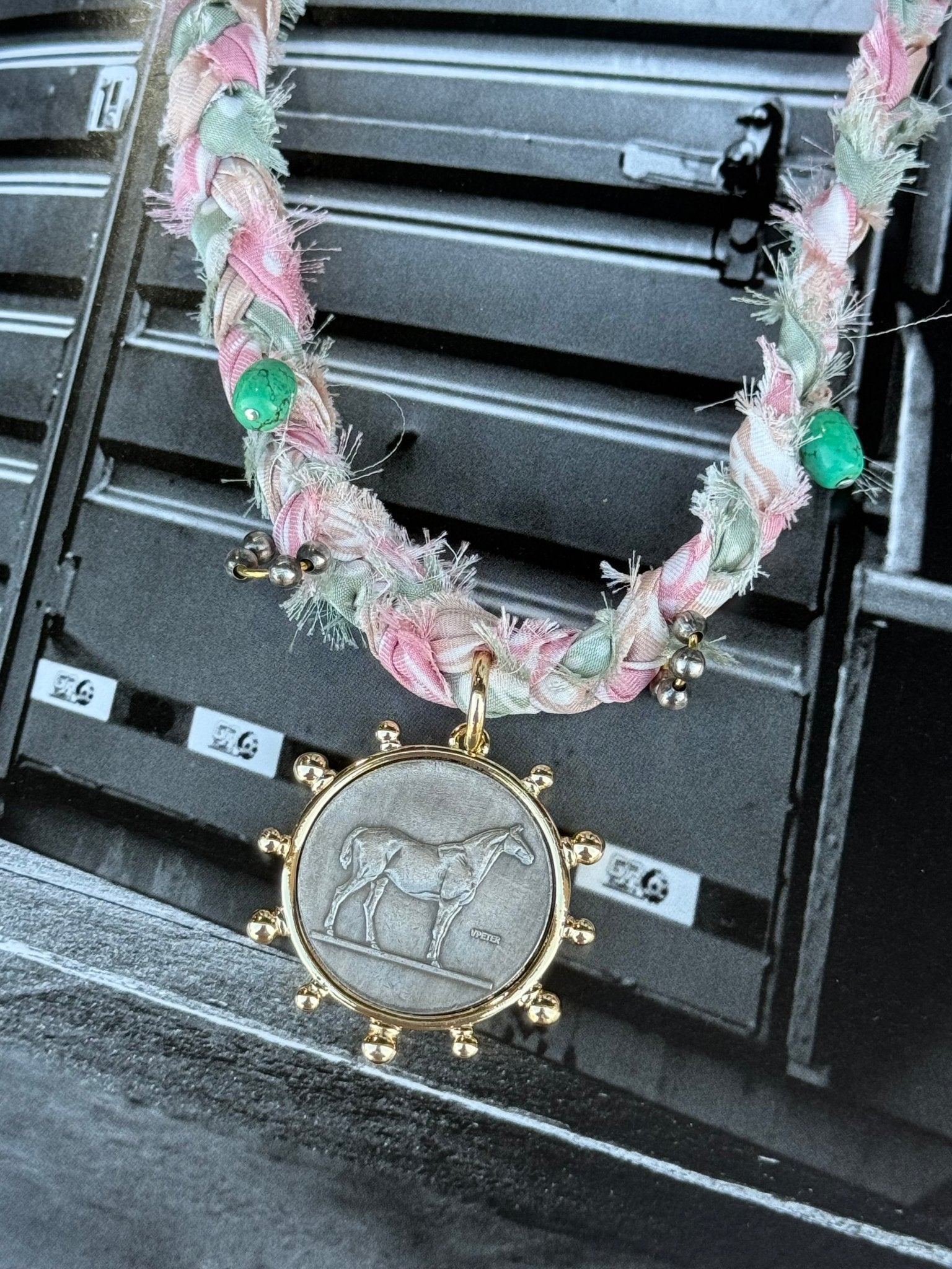 Add a touch of Western edge with this Mixed Metals Braided Bandana Necklace. Featuring intertwined bandana fabric in a unique braided design, holding a vintage-style coin pendant that tells a story of wild roads and dusty trails. Perfect for layering or wearing solo, it’s the bold accessory every cowgirl needs to complete her look.