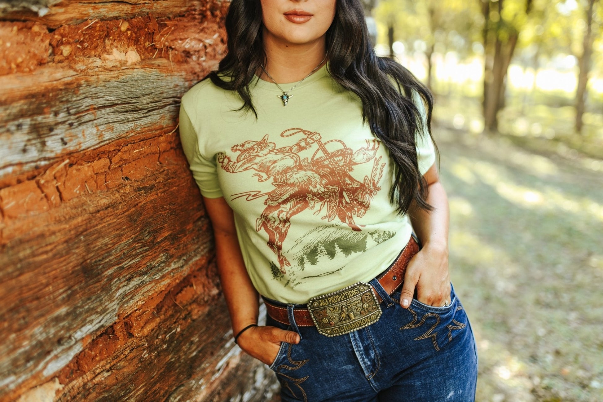 The Santa Cowboy Rider Graphic Tee is a fun and festive way to celebrate the season with Western flair! Featuring a jolly Santa riding a reindeer in true cowboy style, this tee adds a playful holiday twist to your wardrobe. Perfect for spreading Christmas cheer with a touch of the Wild West, it’s a must-have for every cowboy Christmas fan!