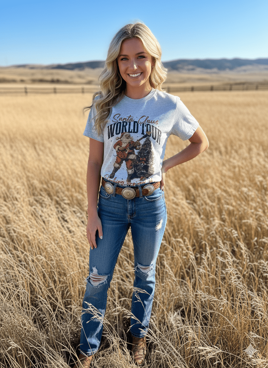 Get in the holiday groove with this Santa Rocking Around the Christmas Tree Graphic Tee. Featuring a fun, musical Santa design on soft, breathable fabric, this tee brings cheerful vibes to every celebration. Perfect for Christmas parties, gift shopping, or just rocking around the tree in comfort and style!