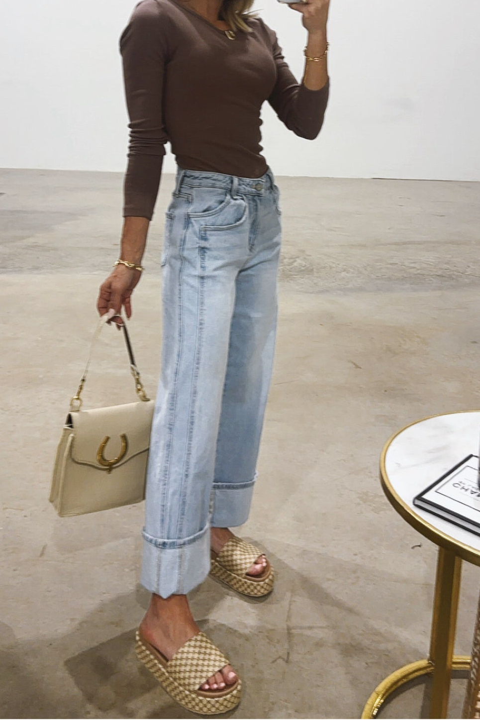 We're in love with these new jeans. High-rise wide leg with a wide cuff that can be uncuffed. Plus, an ultra-cute side seam detailing and no distressing so they're great for school or work.
