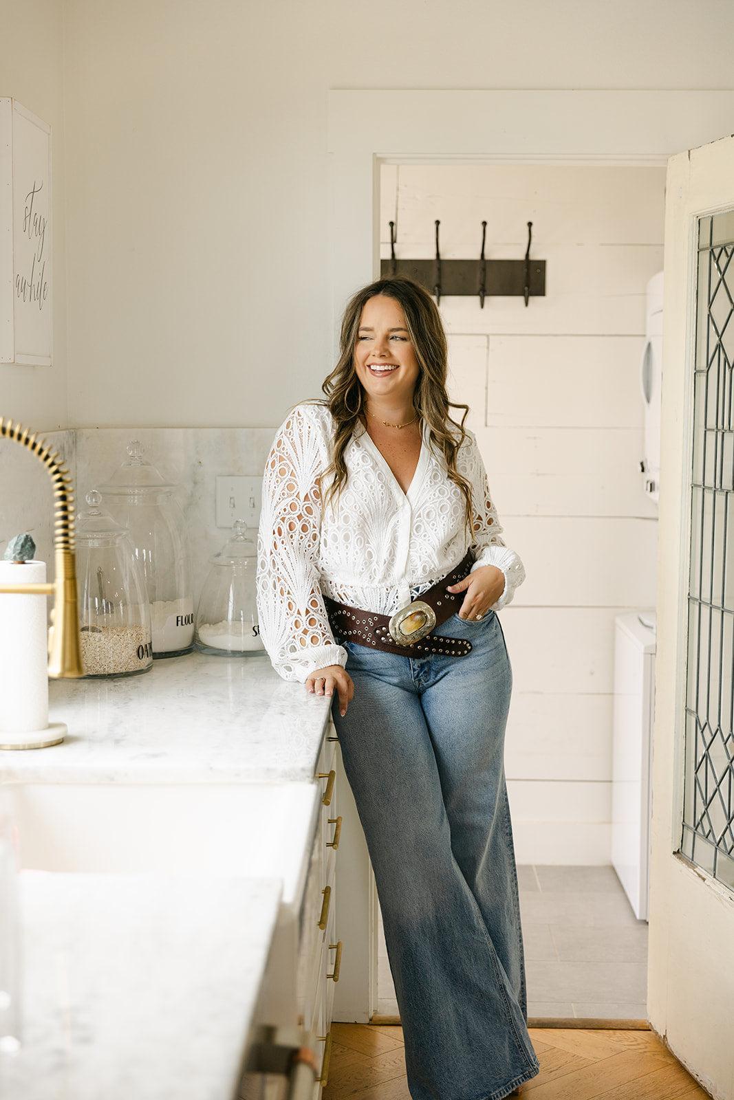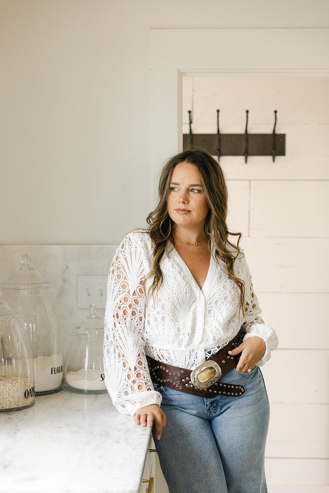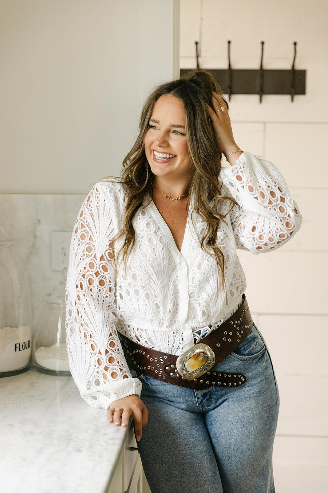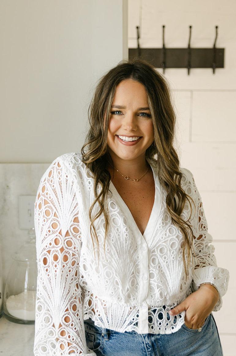 This long sleeve crochet button-down top brings effortless polish with its intricate texture and lightweight feel. Lined bodice with semi-sheer sleeves and softly structured silhouette, it’s the kind of piece that goes from bridal brunch to welcome dinner with ease.