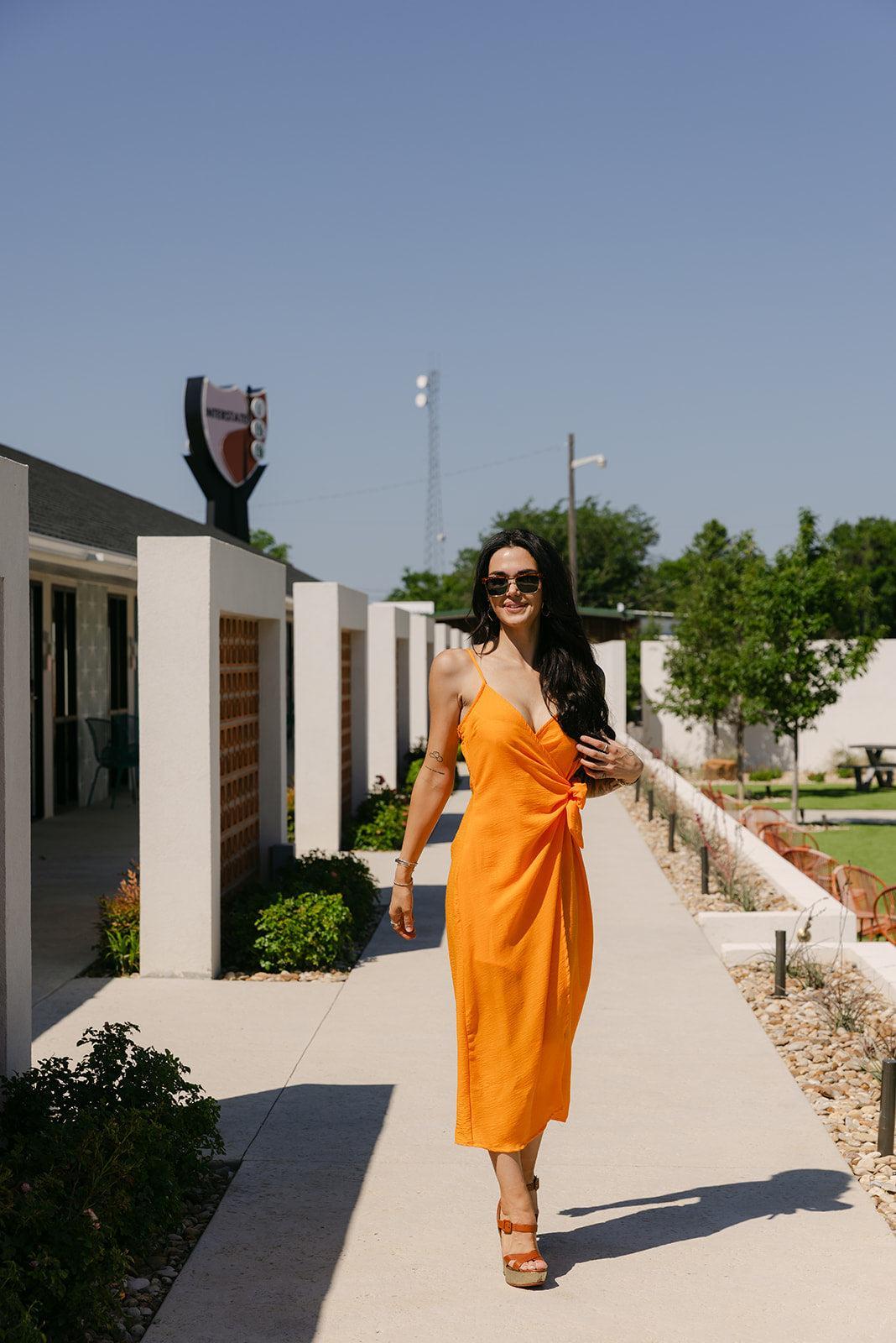 A woven versatile fashion dress in solid color featuring a sweetheart neckline, effortlessly chic, wrap-tie design, adjustable cami straps, and maxi-length.