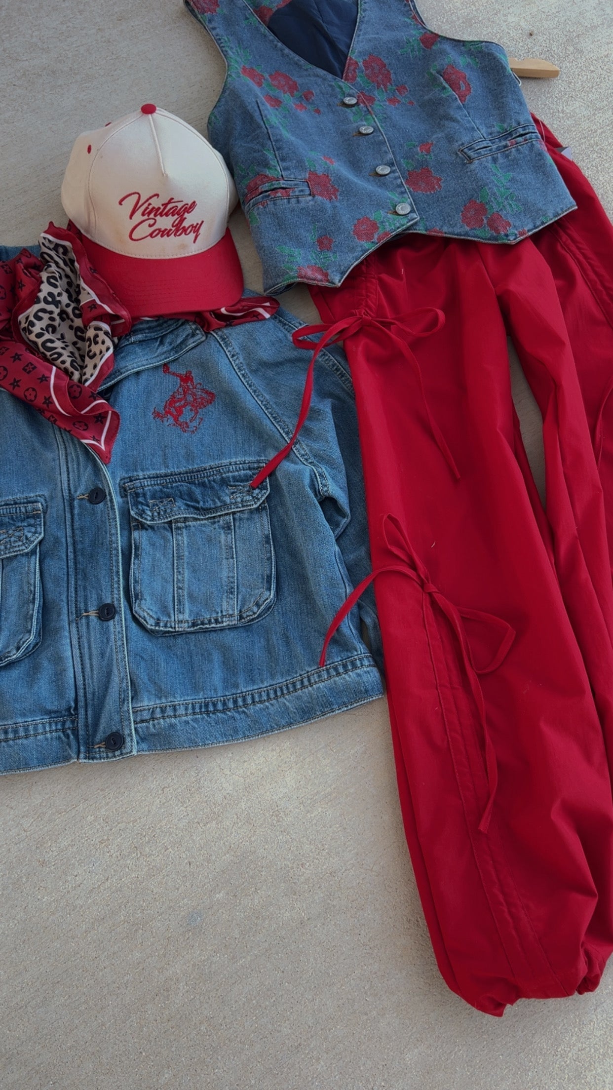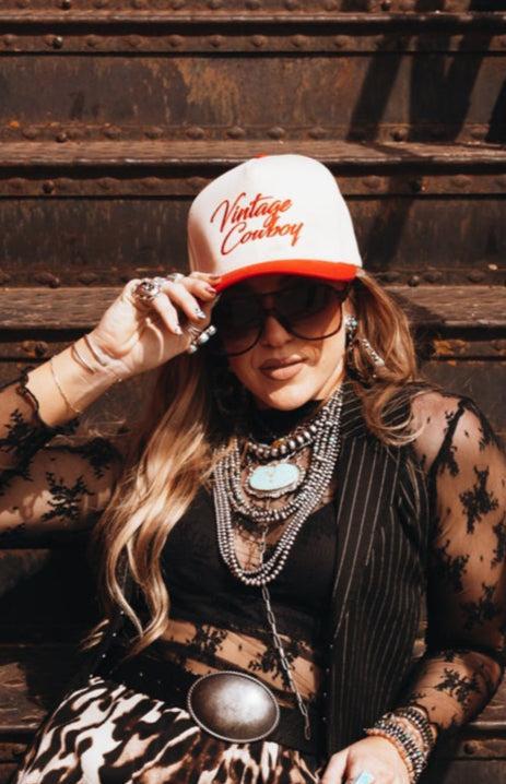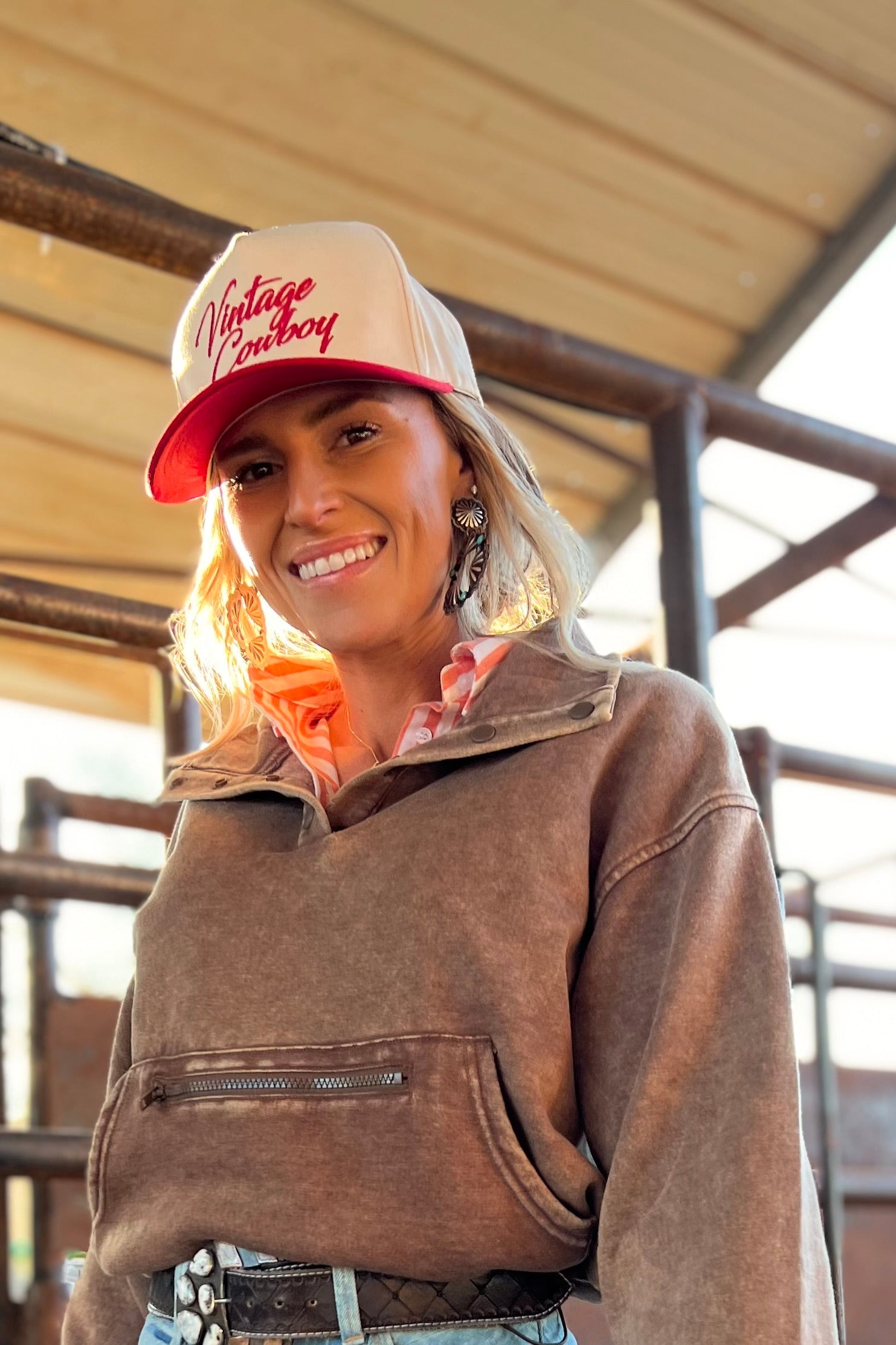 Goes with every outfit. This two-tone baseball cap features “Vintage Cowboy” embroidered text with an adjustable snap back.
